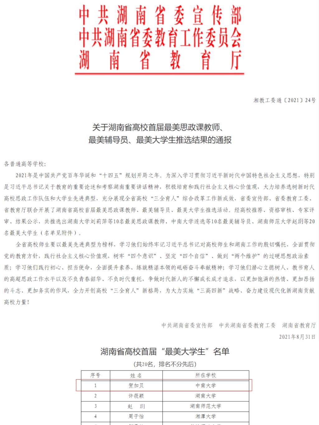 湖南省教育厅最近公布湖南省高校首届最美老员工推选结果,球王会2018级硕士研究生贺加贝获评湖南省高校首届“最美…