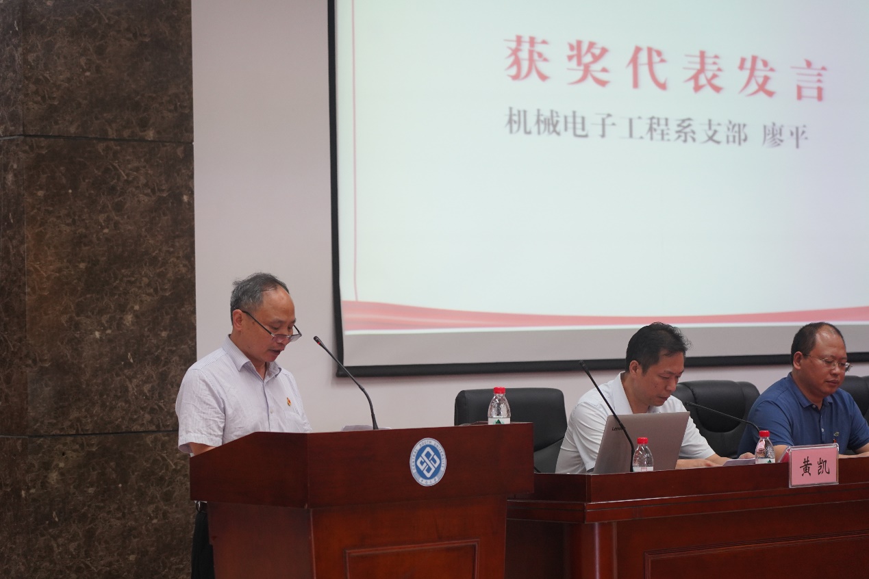 机电系党支部书记廖平同志作为获奖代表发言,分享了新冠肺炎疫情期间支部的建设经验并表达了定将带领支部奋勇争先担使命的决心。他说:“作为一名中共党员和机电系支部书记,能够获得优秀党员称号,既感受到荣誉和组织的信任,同时也是对我们的鞭策。今后,我们定将更加坚定理想信念,对党绝对忠诚,坚守初心使命,勇于担当作为,以一个党员的标准严格要求自己,在本职岗位上务实苦干,在教学与科研工作方面带头发挥先锋模范作用,为学科的发展和新时代的教学改革贡献自己的力量。”