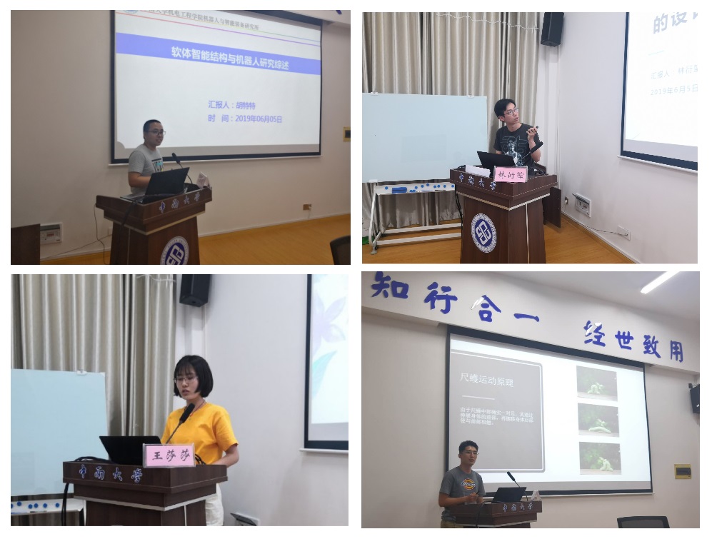 在学术先锋沙龙环节,机电院陆新江教授课题组的4名研究生胡特特、林衍堃、王莎莎和王凯分别用《软体智能结构与机器人研究综述》、《介电弹性体驱动器的设计及应用》、《柔性传感器研究》、《柔性仿生爬行机器人》为大家详细介绍了介电弹性体的性能、应用及其制备方法。期间,湘雅医院的冯修远对该材料的力学性能及驱动方式提出疑问,朱俊宇表示自己课题组正在研究一种可替代人体膝盖软骨的生物材料,希望今后有机会能和该课题组有所合作。