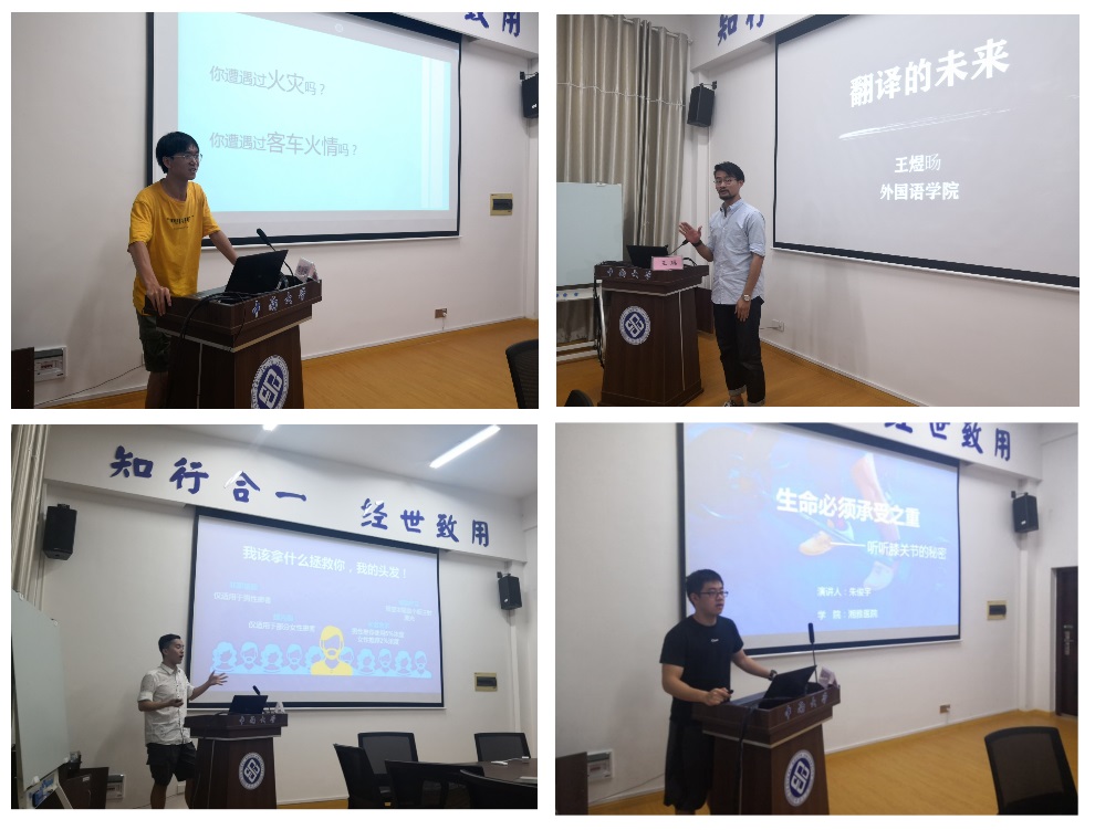 来自交通院的陈琳以自身研究课题为切入点,向大家介绍了长大货物运输过程中所用到的运输方式以及特殊交通工具;资安院的杨沛熹以客车起火的实际经历开篇,介绍了客车安全锤的设计弊端及改良方法;来自化工院的纪宏超向大家介绍了自己设计的算法,并以二维码的形式分享了自己编写的Python代码。