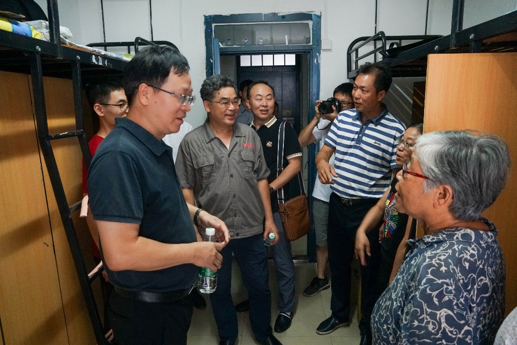 随后,院领导一行来到迎新现场指导迎新工作,慰问参加迎新工作的师生,看望到校的新生和家长们。在升华公寓1栋前,院领导全面了解迎新工作动态,询问新生报到情况,并深入员工宿舍,与刚到校的新生和家长亲切交谈,了解报到手续办理情况。肖来荣书记告诉员工家长:“有什么困难,跟老师或志愿者们说,孩子到这里来学习和生活都有保障,你们可以放心。”