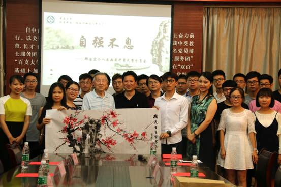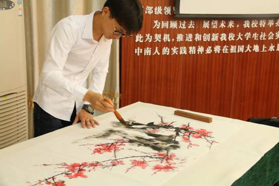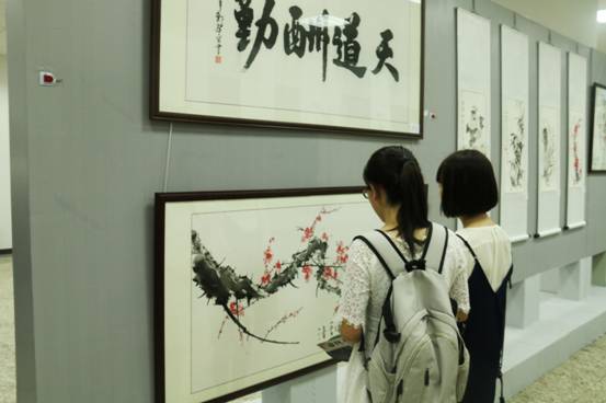 开幕式现场,郑洁宏同学即兴作画,为大家献上了一幅《梅花》,浓淡合宜、气韵生动,当即引热现场气氛。郑洁宏同学在大一时曾经选修过罗红胜教授的书法课,并对老师的指导一直心怀感恩。罗教授表示,工科员工在他的课堂学习后,能够举办个人书画展,他是第一次遇到,也感到非常高兴。而湖南省书法家协会副主席王希俊书记表示,自己也是工科出身,是研究生期间开始深入接触书法,由于兴趣一直坚持到现在。他为郑洁宏作品题词“梅花香自苦寒来”,同时肯定其艺术水准并激励他向着更为专业的方向继续努力。他说:“兴趣与工作的结合让生活和工作两方面同样受益。”