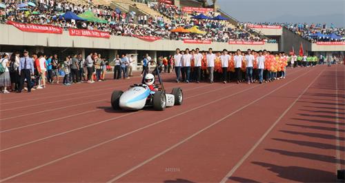 赛车以动力电池和电机为动力源,高效、节能、环保、稳定、安全、可靠是赛车的理念与目标。车队倚靠球王会车辆工程系“新能源”的特色发展方向,50多名队员在公司委派的专家委员会的指导下,全力以赴,用自己的努力与汗水成就了这辆方程式赛车。霸气美观的外形,稳步行驶在队伍的前方,瞬时成为田径场上的焦点。同时,赛车身后的方阵人员高举着红黄气球板,一红一黄的气球上下翻转,变换出梦幻美丽的图案。整个队伍分工明确,协调有序,伴随响亮的口号“机电机电,颜值顶尖,学术出众,霸气外现”,独具特色。
