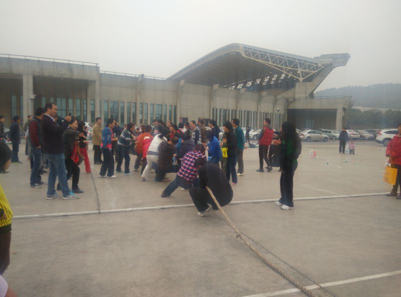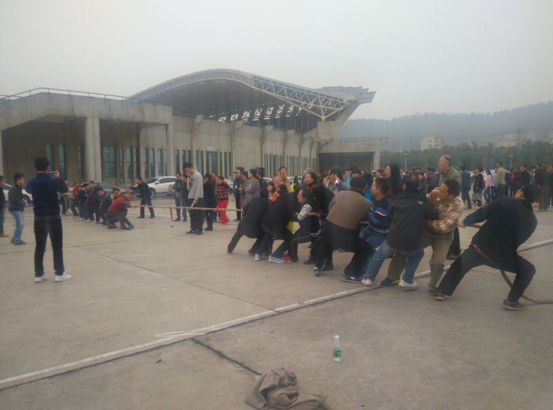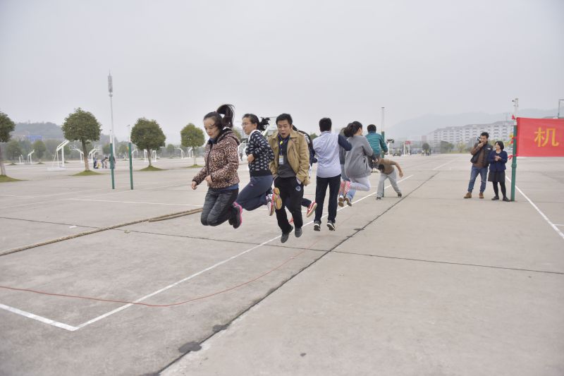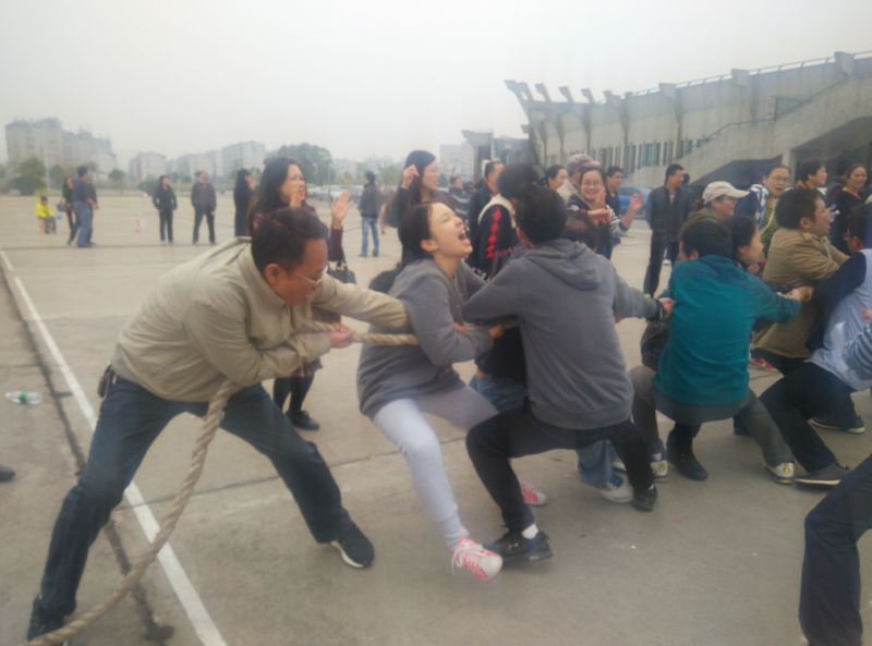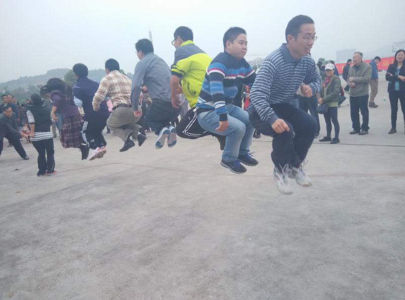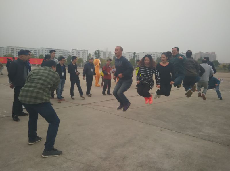 跳绳比赛讲究的是队员的默契和配合,8个队员站成一排齐跳,两端的人挥动长绳。比赛时,有些小组很快找对了方法,2分钟内跳了50个。而有些小组的队员男女老幼齐上阵,一直找不到跳动的节奏和步伐,总是有人绊到长绳,最后弃权跳了0个。最后的拔河比赛,赛制简单且参与度高,是增强小组凝聚力的很好的比赛,大家齐心协力,一鼓作气,使出浑身力气,最后由车辆组摘得大力王的称号。