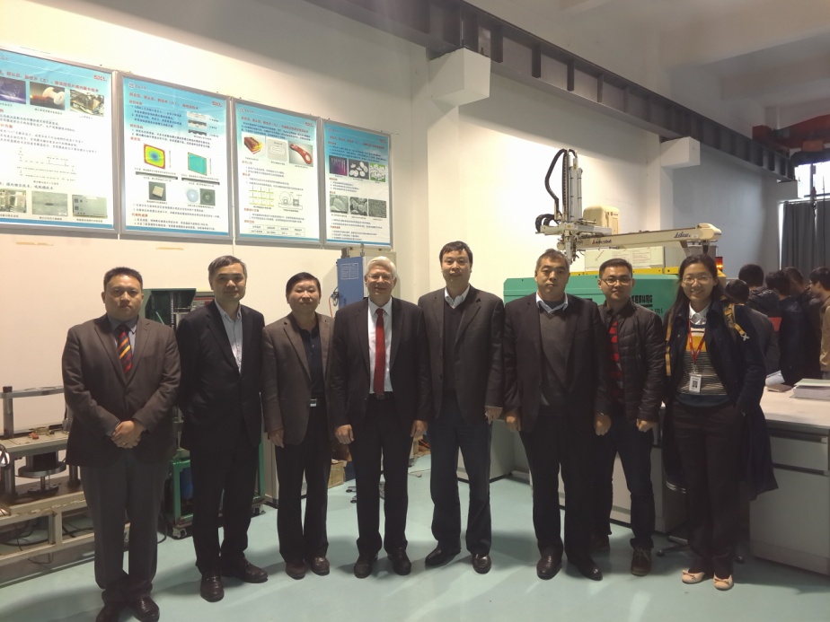 Herrmann教授介绍了空客CTC复合材料技术中心,探讨了航空复合材料技术向轨道交通和汽车轻量化方面的转移潜力。最后,在蒋炳炎教授的陪同下,中车领导一行参观了高性能复杂制造国家重点实验室,并进行合影留念。