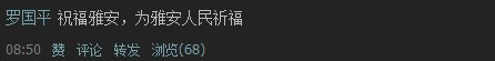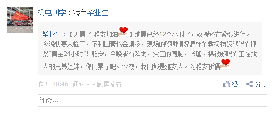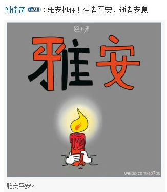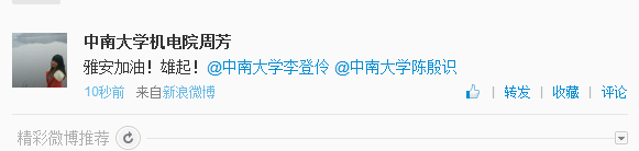 挺住,雅安,我们在中南为你加油;晚安,雅安,我们在湖南为你祈福。