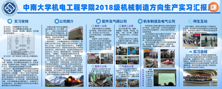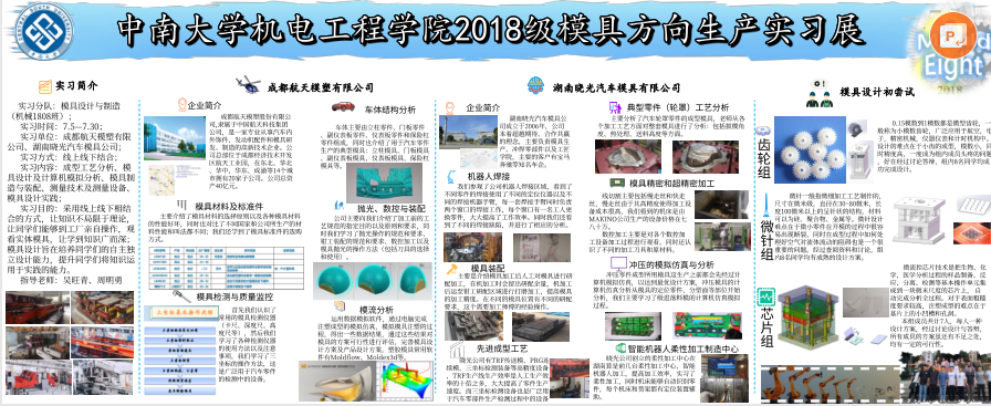 2021年6月-8月,机械设计制造及其自动化专业模具方向、机电方向、机械制造方向共200余名大三员工在吴旺青、薛云、李松柏等老师的带领下分别赴成都航天模塑有限公司、湖南晓光汽车模具有限公司、山河智能装备股份有限公司、中车戚继墅堰机车有限公司等对口企业开展线下线上生产实习。以下是机械设计制造及其自动化专业三个方向同学们的暑期生产实习成果展示。
