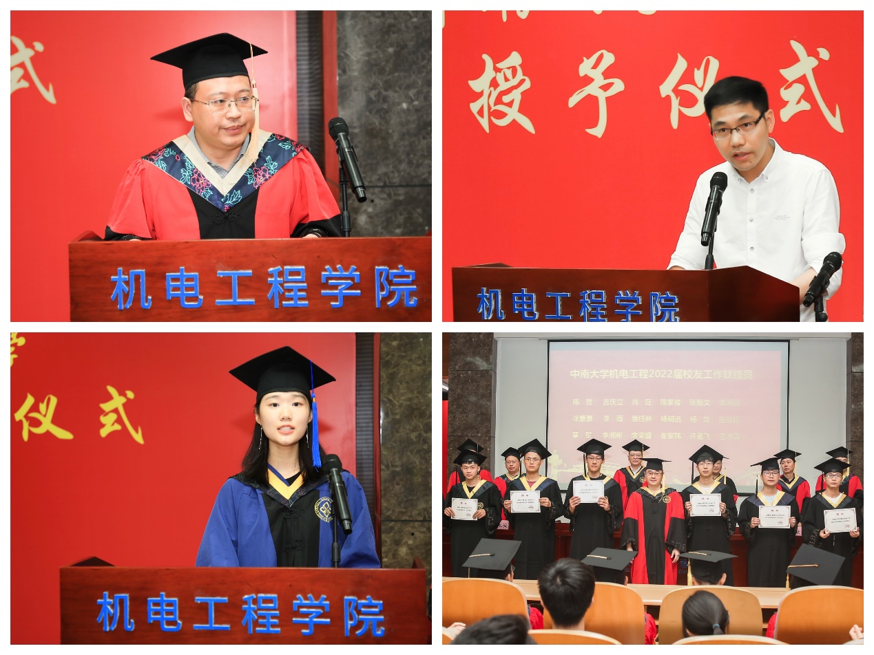 上午8时30分,本科生毕业典礼暨学位授予仪式正式开始。全体师生齐唱国歌后,副经理云忠宣读学位授予决定。本科毕业生代表肖灿城发言,他回顾了在校求学和成长经历,表达了对母校母院、恩师同窗、父母亲友的感激之情。教师代表罗志回忆了师生共处的美好时光,并勉励毕业生知行合一、经世致用,在今后的人生道路上怀揣理想,勇于探索,早日达成奋斗目标。