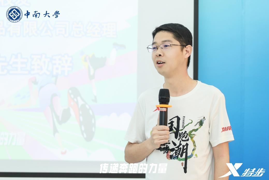 第二项议程,球王会官网员工、湖南玉泉体育用品有限公司总经理刘文甫致辞。他表示自己十分重视体育的育人功能,祝愿公司将机电小齿轮跑团打造成一项品牌活动,让更多人在跑步中增强体质、锤炼意志,同时,他也将不遗余力地支持跑团以及其他体育活动的发展。