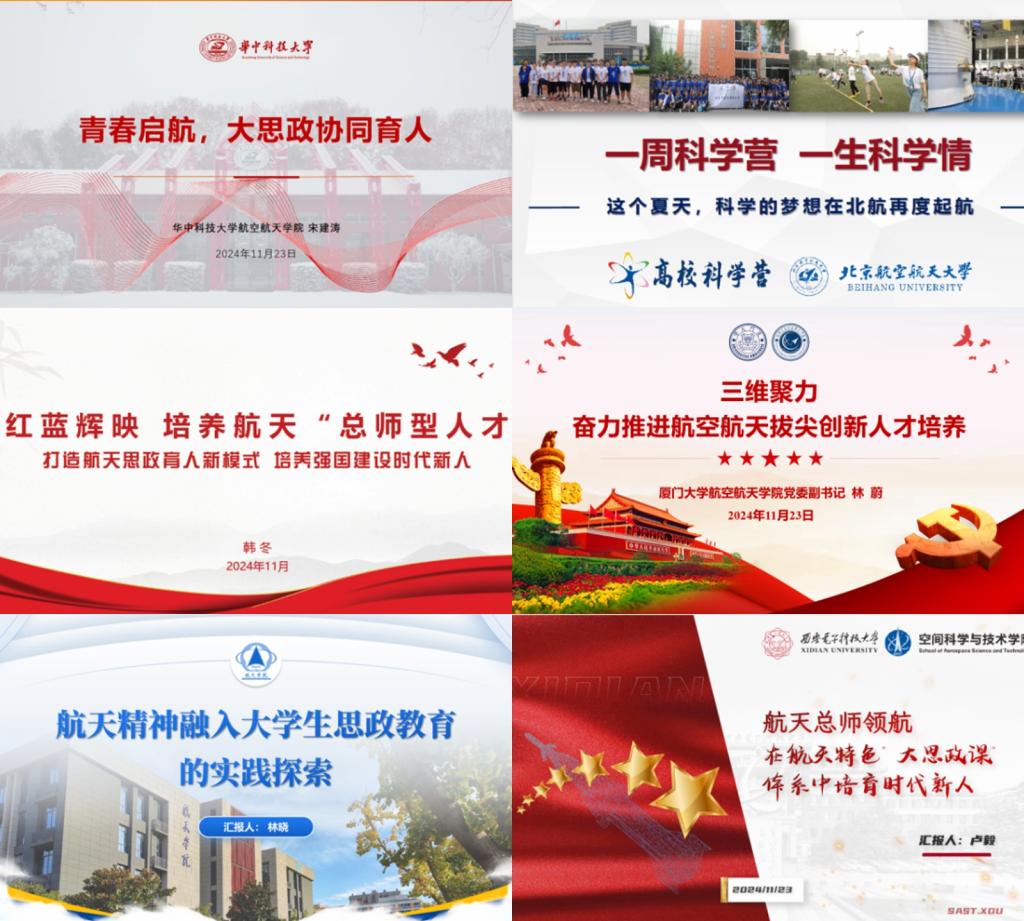 华中科技大学航空航天公司党委副书记宋建涛、北京航空航天大学宇航公司党委副书记赵青、西北工业大学航天公司党委副书记韩冬、厦门大学航空航天公司党委副书记林蔚、南京航空航天大学航天公司副书记林晓、西安电子科技大学空间科学与技术公司党委副书记卢毅分别就航空航天专业党建和思政工作特色和亮点、创新拔尖人才培养模式、育人格局等方面做了精彩报告,全国最美高校辅导员、南昌大学人文公司党委副书记胡邦宁和公司辅导员连选老师对报告进行了详细点评。
