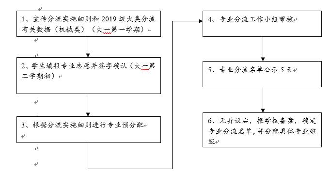 机械类专业分流工作从大一第二个学期四月份开始(具体时间以本科生院的通知为准),工作流程如下:
