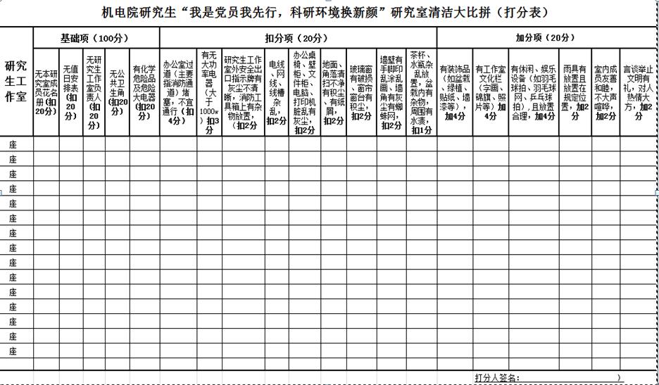为进一步倡导机电文明之风,树讲卫生意识,推动公司营造一个温馨舒适的科研环境,促使研究生养成一种习惯、一种美德,展现机电的风采,特在广大研究生中有党员带头开展机电院研究生工作室卫生大比拼活动。现将有关事项通知如下: