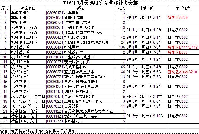 2016年9月份机电院专业课补考安排