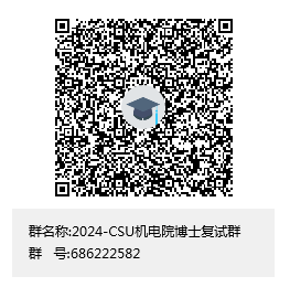 公司2024年博士研究生考核复试录取工作采用线下现场考核复试的形式。为方便通知及统一安排,请于5月1日前加QQ群:686222582 (2024-CSU机电院博士复试群)。