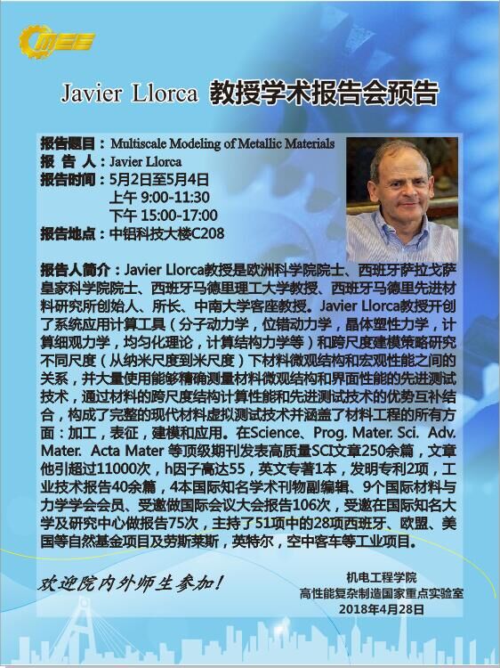 报告人简介:Javier Llorca教授是欧洲科公司院士、西班牙萨拉戈萨皇家科公司院土、西班牙马德里理工大学教授、西班牙马德里先进材料研究所创始人、所长、球王会官网客座教授。Javier Llorca教·授开创了系统应用计算工具(分子动力学,位错动力学,晶体塑性力学,计算细观力学,均匀化理论,计算结构力学等)和跨尺度建模策略研究不同尺度(从纳米尺度到米尺度)下材料微观结构和宏观性能之间的关系,并大量使用能够精确测量材料微观结构和界面性能的先进测试技术,通过材料的跨尺度结构计算性能和先进测试技术的优势互补结合,构成了完整的现代材料虚拟测试技术并涵盖了材料工程的所有方面:加工,表征,建模和应用。在Science.Prog,Mater.Sci.Adv.Mater.Acta Mater 等顶级期刊发表高质量SC文章250余篇,文章他弓|超过11000次,h因子高达55,英文专著1本,发明专利2项,工业技术报告40余篇,4本国际知名学术刊物副编辑、9个国际材料与力学学会会员、受邀做国际会议大会报告106次,受邀在国际知名大学及研究中心做报告75次,主持了51项中的28项西班牙、欧盟、美国等自然基金项目及劳斯莱斯,英特尔,空中客车等工业项目。