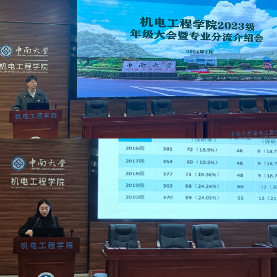 3月25日晚7点,公司本科2023级年级大会暨专业分流介绍会在机电楼B214报告厅举行。公司云忠副经理、何虎副教授、周元生副教授、23级辅导员章佳琪、李明帝及全体23级本科生参加本次会议。大会伊始,辅导员李明帝老师对上学期年级的挂科情况、学风建设情况进行了全面的分析,并列举出了未来学习中的重点、难点课程。李老师以树的成长为例,比喻了学术成就与个人发展的关系,强调综合能力和个人素养的提高,并鼓励同学们积极参与各类...
