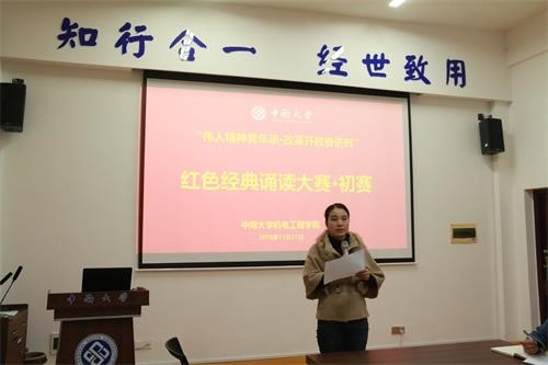 11月21日下午,公司“伟人精神青年承,改革开放奋进时”红色经典诵读大赛初赛在机电楼C506多媒体室举行,学工办主任童俊杰、公司团委书记周芳、17级辅导员付彪担任初赛评委,来自18级的9组参赛选手表现出色,诵读热情澎湃,比赛十分激烈。