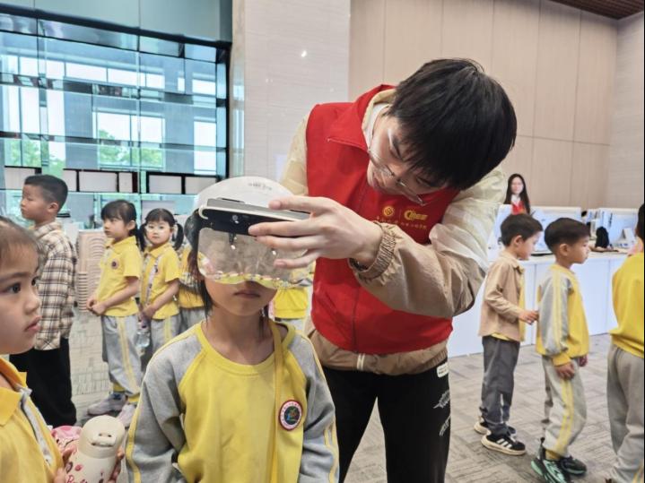 活动伊始,大家在工程训练中心门口合影留念。随后志愿者们带领小朋友们前往虚拟现实中心展开学习。在这里,志愿者甘博文向大家细致讲解了虚拟现实技术的发展历史以及广泛应用。小朋友们沉浸在讲解中,积极地思考、讨论并回答志愿者提出的问题。在对虚拟现实技术有了更深入的了解后,志愿者们帮助孩子们戴上VR设备,带领他们体验这项技术。小朋友们徜徉在科技的海洋中不亦乐乎,现场充满了欢声笑语。