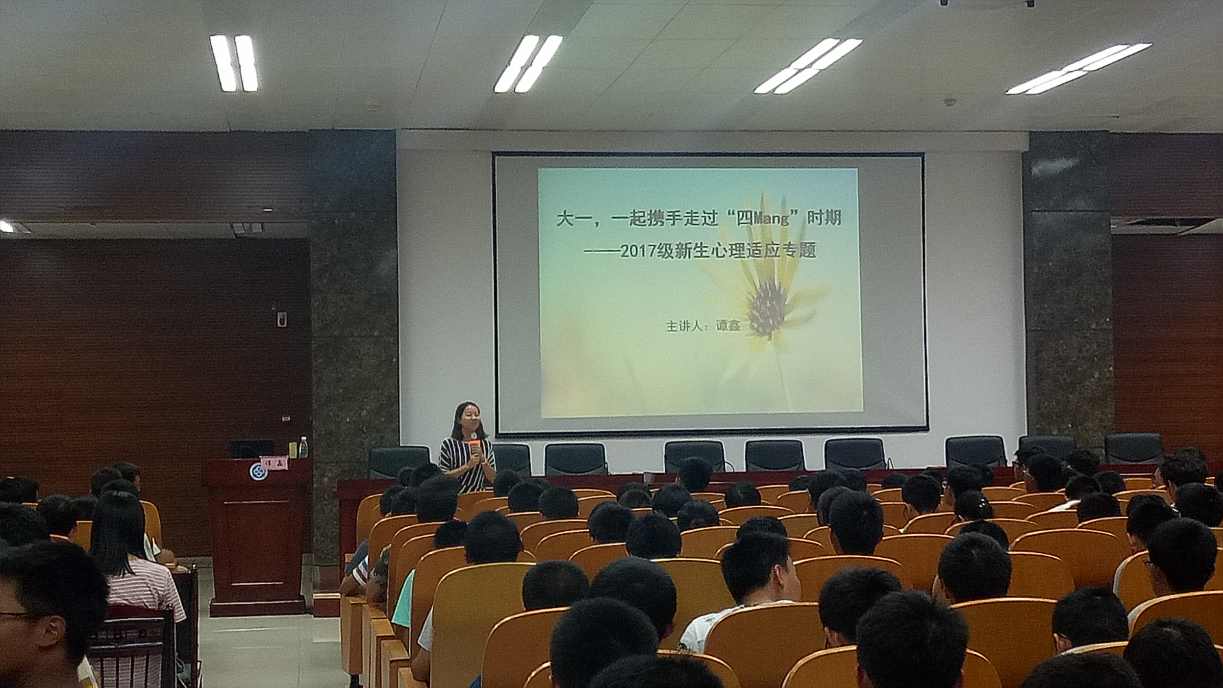 在此次谭鑫老师的演讲给大一新生讲解在适应阶段有一些焦虑不安与抑郁是正常的情况,并且介绍了解决这些问题的方法。只要正视这些问题并且及时寻找解决办法积极面对,就可以找到一把开启光芒大门的钥匙。