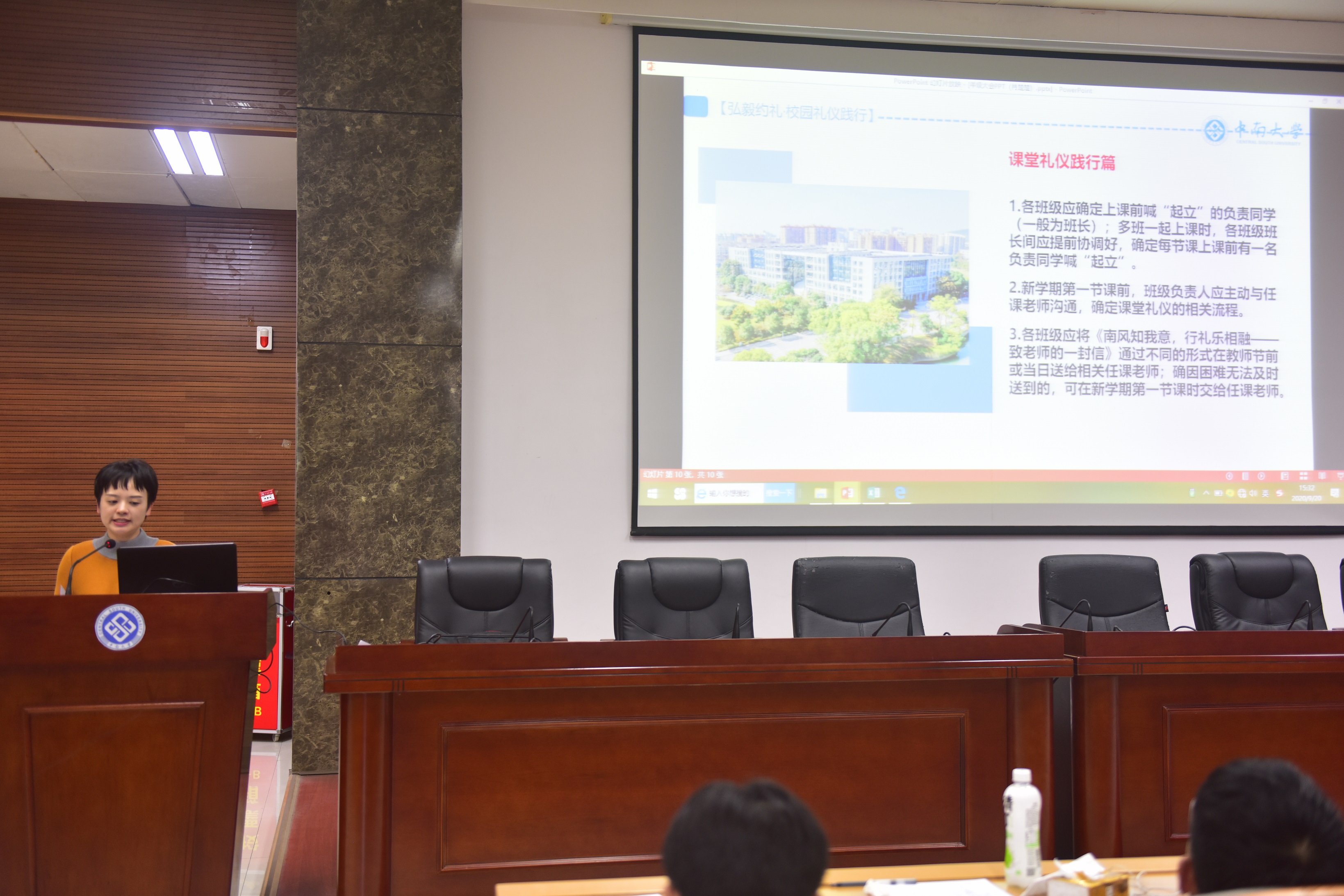 肖楚楚老师通过几个发生在疫情期间的故事,生动形象地讲解生活中礼仪的重要性,希望同学们做一个“讲文明、懂礼貌、讲纪律、懂规矩”的老员工,养成知礼、懂礼、守礼的好习惯。肖老师强调了本学期弘毅约礼十大校园礼仪活动,让同学们做到学而知礼、信以守礼、乐在行礼,彰显中南学子文明礼仪新风采,并带领大家共同演练课堂礼仪流程。同时在员工干部会议上布置课堂礼仪相关工作。
