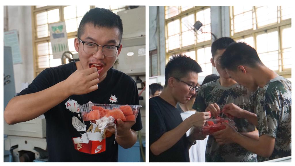 在与实训负责人李燕老师交流员工实训基本情况后,黄凯书记一行先后来到焊接车间、3D打印工作室、数控加工中心看望慰问正在进行焊接训练、3D模型制作、无碳小车测验的员工们,了解了金工实训内容、时间安排及各项工艺操作流程,聆听了同学们的实训体悟与收获,询问了同学们在学习、实训、生活上的困难与困惑,给予实训员工细心指导与鼓励,并为同学们送上可口的西瓜。