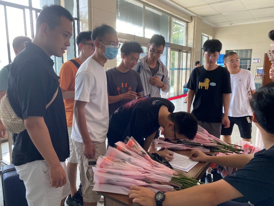 机电楼A座一楼大厅摆满了馥郁芬芳的玫瑰花,“机电院学子祝全体老师教师节快乐”的标语横幅悬挂在大厅中央,一进大门就能感受到现场洋溢着欢乐的节日氛围。上午7时始,公司老师和员工们陆陆续续地来到了活动现场,员工们纷纷在签名薄上写下对老师的真切祝福,领取鲜花送给老师,以鲜花感念师恩,向老师表达敬爱。