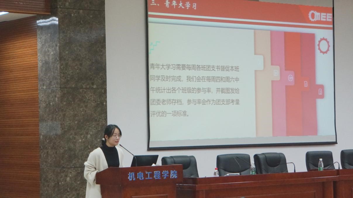 10月23日上午,公司团支书培训会在机电楼B214报告厅举行。会议由公司团委书记章佳琪、团委组织部部长梁盈盈主持,全体团支书参与此次培训会。