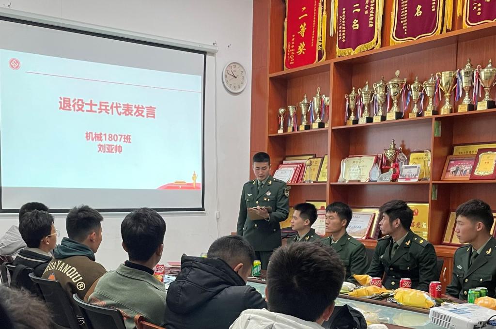 退役士兵代表机械1807班刘亚帅同学发言,他用切身经历为同学们讲述自己入伍动机、军营趣事、成长历程等,深深地鼓舞着现场的每一位同学。