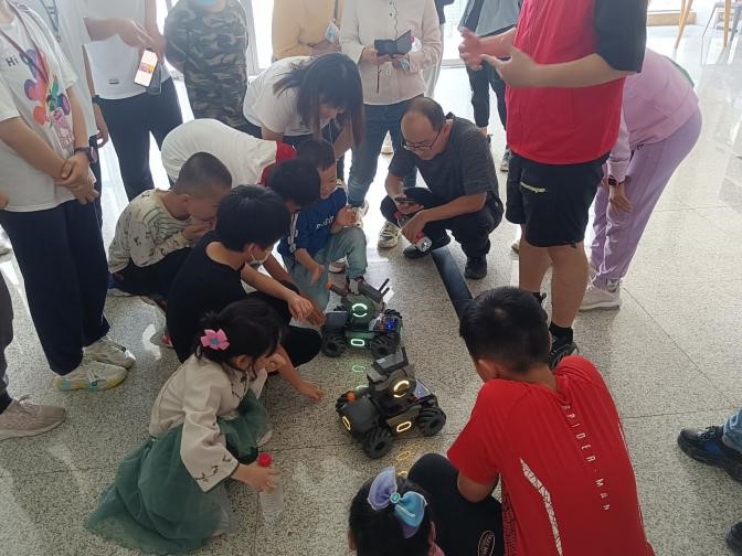 接着,志愿者带领小朋友们和家长来到了“书香中南·文润机电”育人基地。同学们流连于基地的文韵墨香,频频称赞。志愿者麻展豪同学拿出来3D打印的小兔子与恐龙,让同学们进行传看,近距离感受3D打印技术的科技感和真实感。紧接着,同学们观看了精彩的机器人表演。对于小朋友来说,机器人通常存在于科技电影里,孩子们天真的眼眸充满了对机器人的好奇与向往,都想近距离触摸这充满神秘感的机器人。