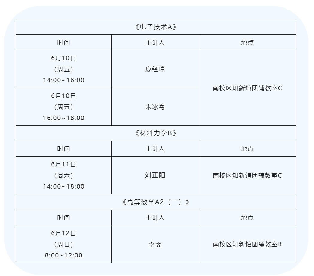 针对高年级难度较大的科目,小齿轮学业辅导站派出“十佳辅学义工”辅导团队,在南校知新馆面对全院有需求的同学进行《电子技术A》、《材料力学B》以及《高等数学A2(二)》课程辅导。辅导团队细心准备,同学们参与热情高涨,辅导效果良好。