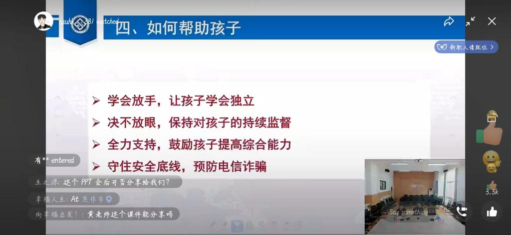 见面会上,球王会官网老员工心理健康教育中心谭鑫老师以“风筝飞远,还需您拽住手中的线”为主题进行了视频讲座,进一步与家长探讨如何让新生更好地度过大一关键期。