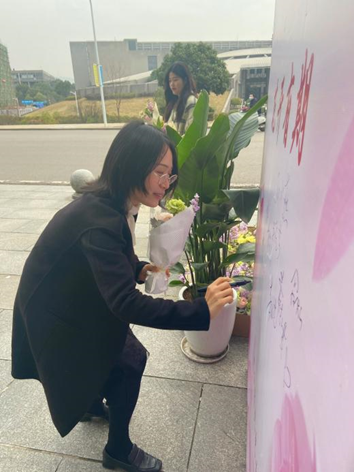 上午8点,由戴泽宇、叶茂、李明帝等男职工代表组成的“爱心团”将包装精美、代表诚挚祝福的花束送到女教职工手中,引导她们在签名墙上签名,并合影留念。“爱心团”代表公司师生感谢女教职工们一直以来在工作岗位上兢兢业业、恪尽职守、拼搏奉献,并勉励她们继续发扬“巾帼不让须眉”的担当精神,立足岗位,用细心、爱心和耐心做好师生服务工作。