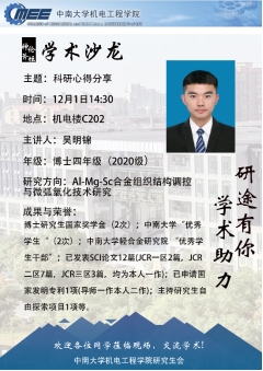 2023年12月1日下午,公司于机电楼C202成功举办神斧论坛学术沙龙,宣讲主题为:Al-Mg-Sc合金组织结构调控与微弧氧化技术研究。此次宣讲会由公司研究生会学术部主办,20级博士吴明锦主讲,吴明锦同学曾获博士研究生国家奖学金,优秀员工,优秀员工干部等多项荣誉,发表论文12篇,发明专利一项,该场学术沙龙吸引了许多同学前来学习。