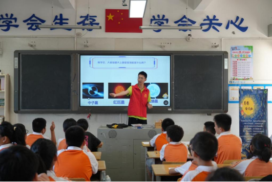 随后,麓园志愿者陈汉桥走上了讲台,为同学们缓缓揭开了天体的奥秘。他通过介绍星星、黑洞和月亮等天体现象,为小朋友们科普了许多有关天文的知识。在他的讲解下,小朋友们仿佛置身于浩瀚的宇宙之中,感受到了宇宙的神秘与壮丽。在提问环节中,小朋友们热情洋溢地举起手来,积极回答志愿者的问题。他们的思维活跃、好奇心旺盛,展现出了对科学的浓厚兴趣。