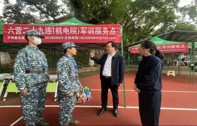 随后,肖来荣书记前往服务点看望伤病连的同学们,了解他们的身体状况,叮嘱他们注意保暖、多加休养,肯定了其为军训开展的宣传、服务等工作,表示他们虽然无法参与高强度训练,但依然心系军训、贡献力量,希望同学们将这份责任感、集体荣誉感等优秀品质贯彻到未来的学习与生活中。