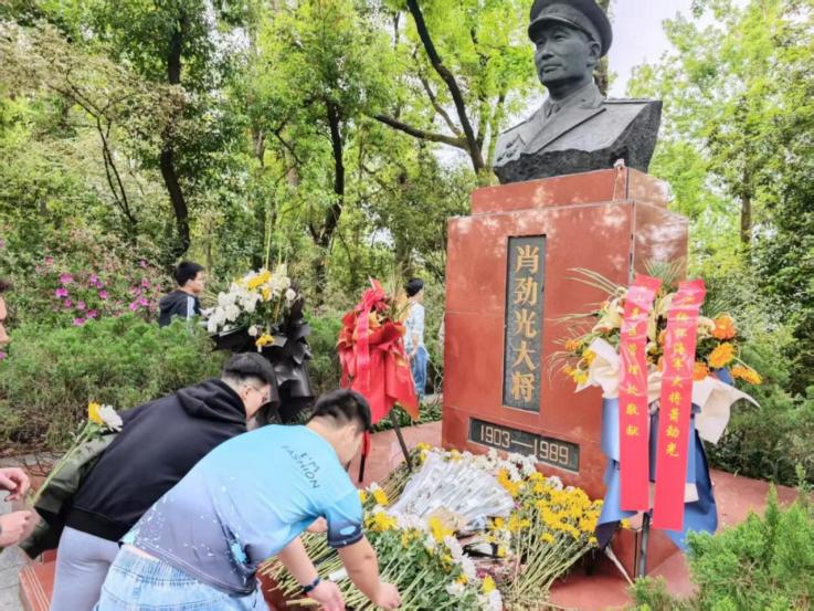随后,同学们一同前往肖劲光大将纪念碑,举行清明祭英魂活动。全体成员在碑前整齐列队,神情庄重。员工代表宣读祭文,追忆肖劲光大将为民族独立、人民解放和国防建设所作出的卓越贡献,并代表全体青年表达继承先烈遗志、奋发有为的坚定决心。随后,员工会与研究生会代表依次上前,向纪念碑敬献鲜花,深切缅怀英烈功绩。在默哀环节,山风阵阵、松涛低语,仿佛也在倾诉着对英雄的敬仰与哀思。