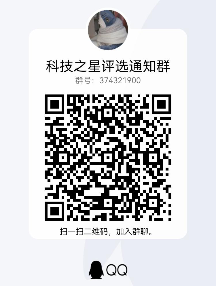 填写报名表(附件1)、参评材料(附件2)和全部电子版文件(存于文件夹并压缩后以“科技之星+本科生/研究生+姓名评比材料”命名)于12月3日17:00之前发送至邮箱csucmeekjb@163.com,邮件名同文件名。纸质稿于12月3日17:00之前交到机电楼B209。报名后请扫码加群。