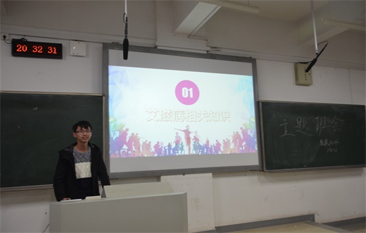 林京同学精心准备PPT,开展艾滋病主题讲座,为同学们讲解艾滋病有关知识,并分析了艾滋病传播和预防等相关问题。林京同学将知识讲解与知识竞答活动相融合,讲解时同学们认真听讲,知识竞答活动全班同学积极参与,现场气氛活跃,主题讲座取得了良好的效果。