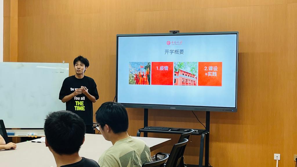 班会伊始,班长从疫情防控、学风建设、安全教育、发展规划等方面进行阐述。他表示在疫情肆虐的大环境下,同学们每个人都是疫情防控的责任主体,大家要紧绷疫情防控弦,严控行程轨迹、监测身体状况。随后,他结合各科目的分数分布情况分析了上学期成绩状况,叮嘱同学们认真做好机械设计课程设计和电工电子实践,并分享安全注意事项。最后,他提出大三初期,大家应该思考发展,做好规划。