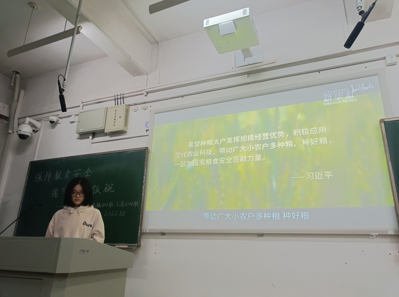 10月22日下午,“保障粮食安全·端牢中国饭碗”主题班会如约开展,同学们端坐于A座117教室内,聆听粮食安全发展的奋斗史,缅怀“国之脊梁”袁隆平院士,于心厚植实干精神。
