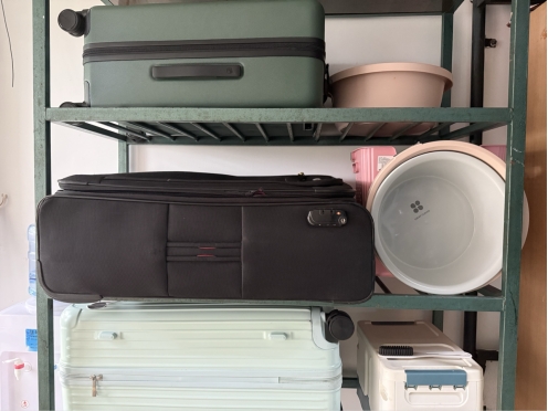 再看置物架,行李箱、洗漱盆等物品分类摆放,整齐划一。这正契合了“房间内各种物品放置整齐划一,行李包(箱)、书籍、洗漱用具等均应按归类摆放”的规范。